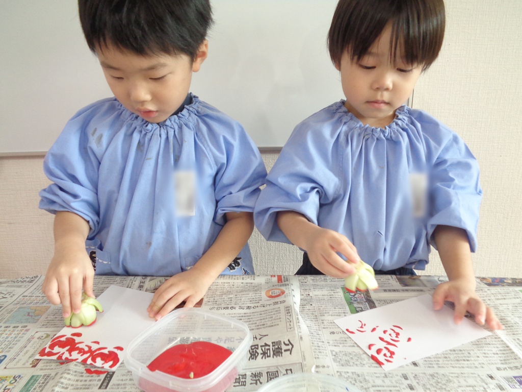 9月15日の敬老の日に向けてプレゼント製作を行いました! 今回はチンゲン菜の茎を使ってばらのスタンプをし、「きれいな形になるね!」「すご~い!」と驚いていました☆彡 ばらの葉っぱの形や葉脈などよく見て絵を描くことができました🌹