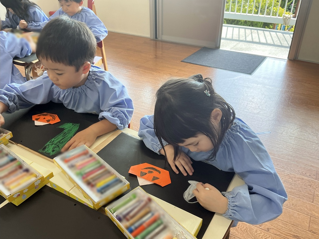 土曜参観で折ったかぼちゃに顔を描いたり、周りにハロウィンの絵を描きました! 色を塗る時は、下の画用紙が見えないようにしっかり塗ることや紙いっぱいに絵を描くことを頑張りました♪ 「ハロウィン楽しみだな~」と当日を楽しみにしている年中組さんでした♡