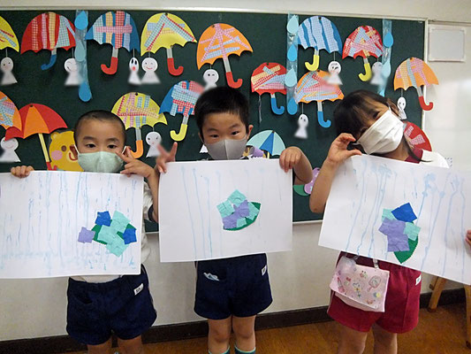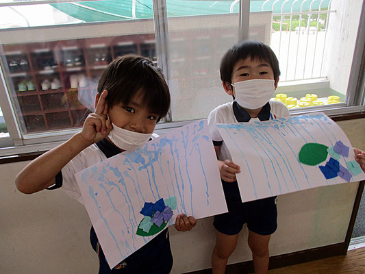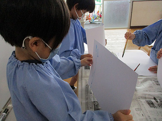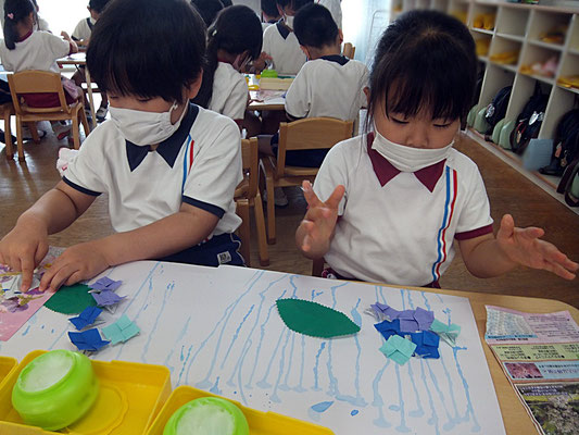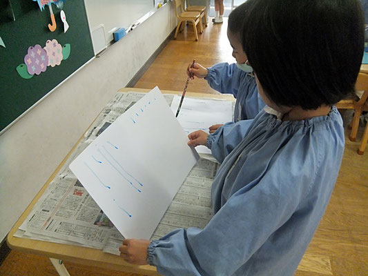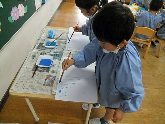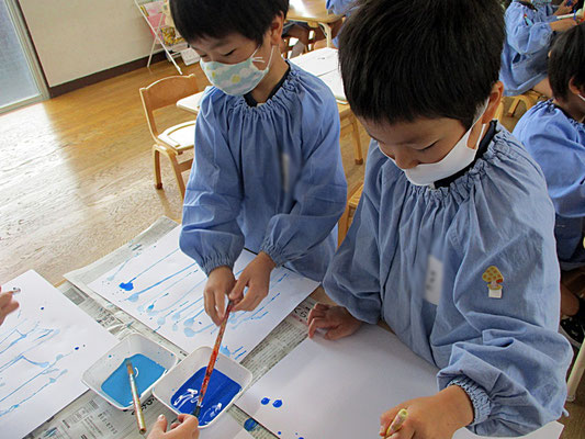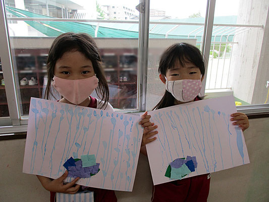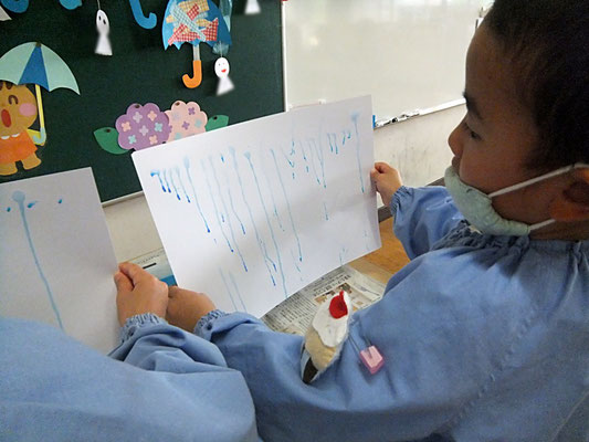 始めに、画用紙に”たらし絵”を行い、雨を表現しました。