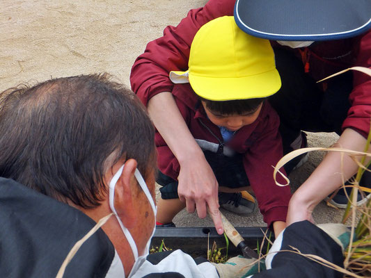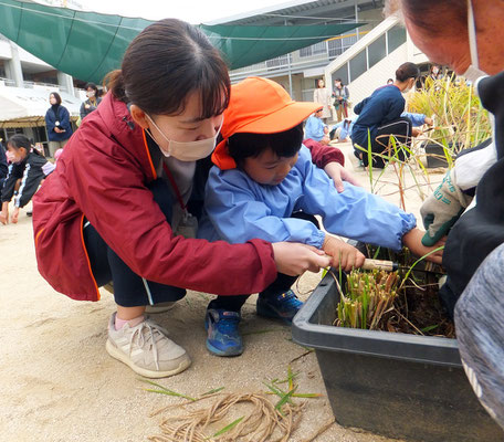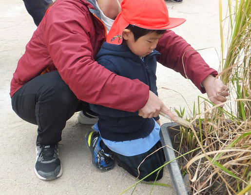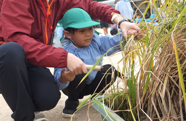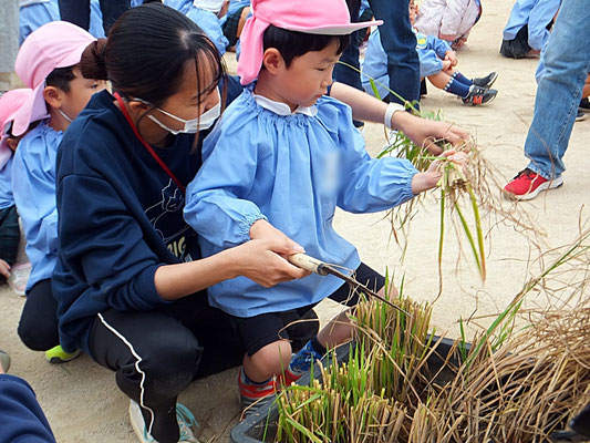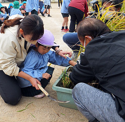年中組さん、年長組さんは昨年も行った稲刈りのやり方を思い出しながら担任の先生と一緒に稲刈りをしました。