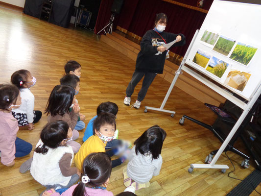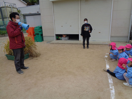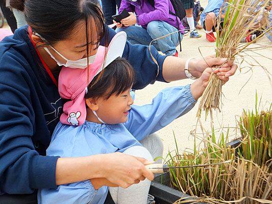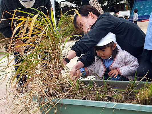 ぱんだ組さん、年少組さんにとって初めての稲刈り。