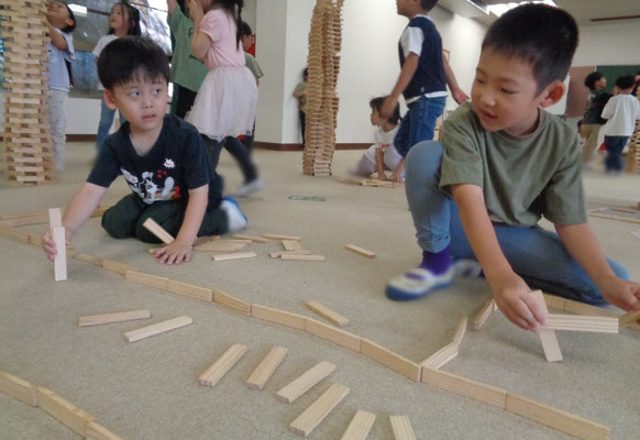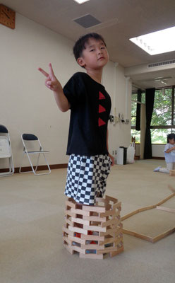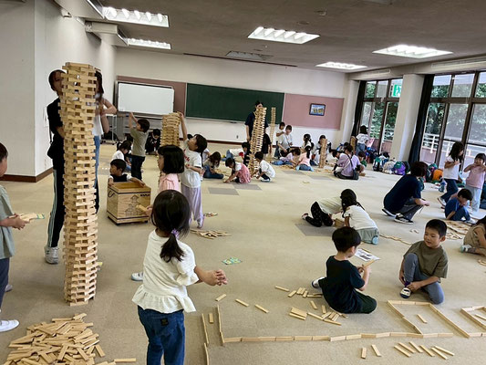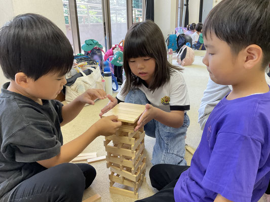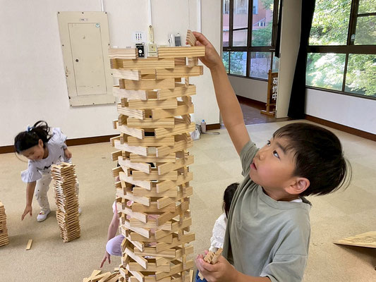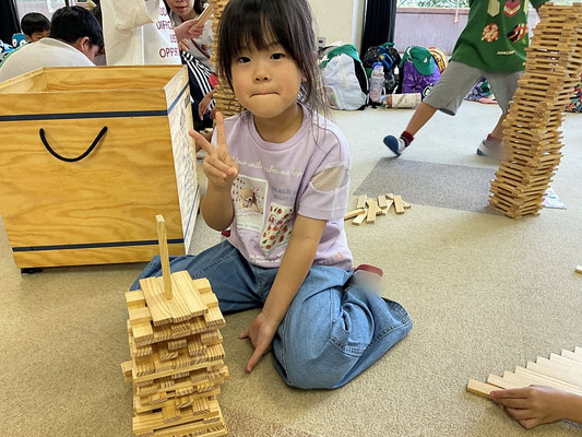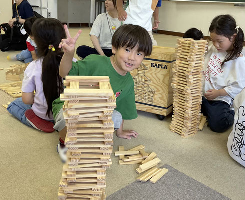 お友達と協力して作ったり、オリジナルな作品を作ったり、どこまで高く積み上げれるか勝負したり、楽しんでいました♪