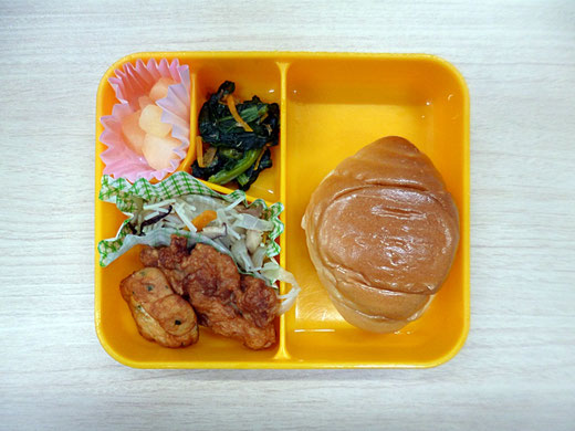 ちどり日記 · 2025/09/10 【9月10日】今日の給食です 今日のメニューは、 ・鶏肉の唐揚げ ・花型豆腐 ・焼ビーフン ・小松菜のおかか和え ・りんごのシロップ漬 ・バターロール です。 tagPlaceholderカテゴリ: