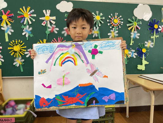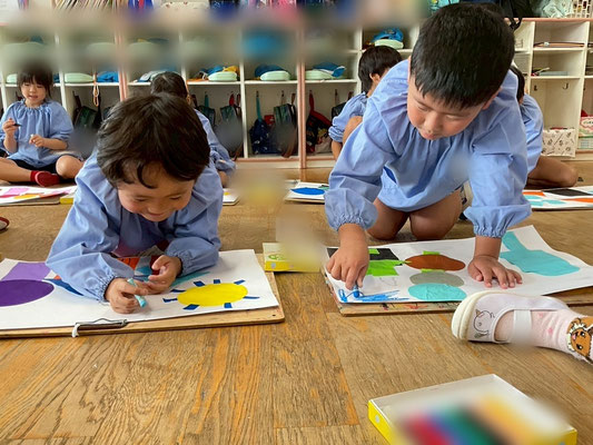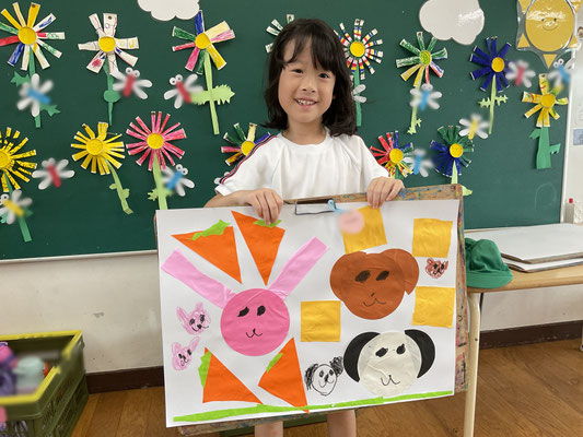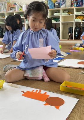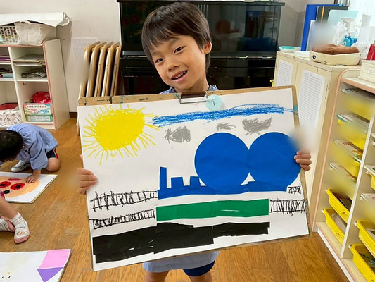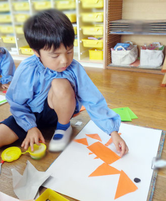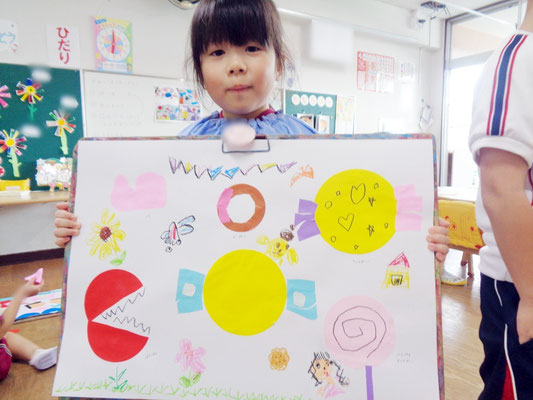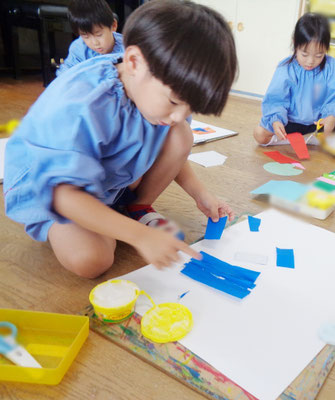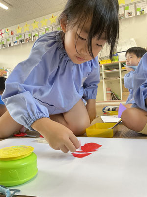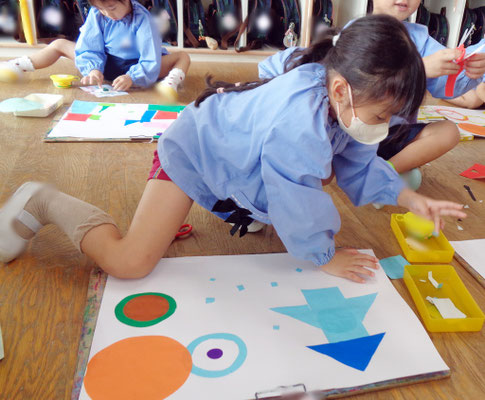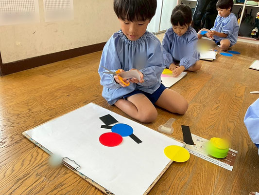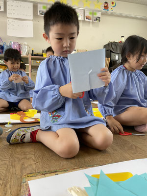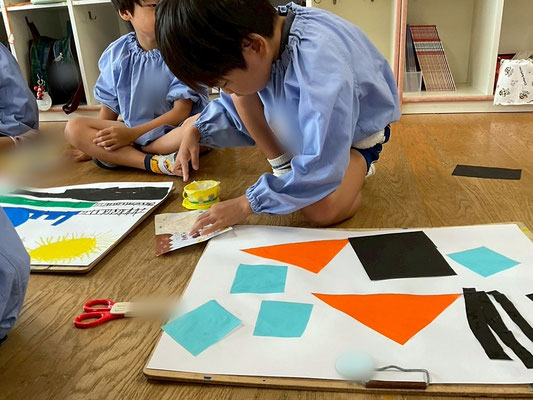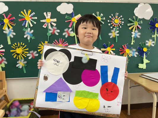 年長組 · 2025/09/12 (年長組)〇△□でなに作る? 〇・△・□のみを使って、自由に好きなものを作る、構成あそびをしました! 四角や三角は自分で折り目を付け、はさみで切って作りました。 大きいサイズにしたり、どんどん折って小さくしてみたり…たくさん工夫しながら作る姿が見られましたよ♪ 「ロケット」や「動物」「キャラクター」などができ、「えー!それかっこいいね!」「すごーい!じょうず!」など、友だち同士でお話もしている様子も見られました✨ 個性あふれる素敵な作品ができたね♡ tagPlaceholderカテゴリ: