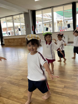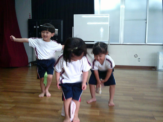 まずは落とさないようにバランスを取りながら動きました。頭にのせたり、あごやわきに挟んだり、足で挟んで歩くのもとても難しかったけど頑張ったね☆