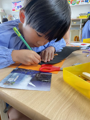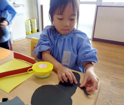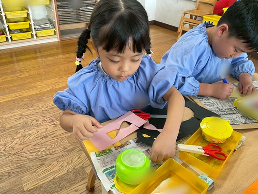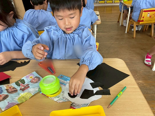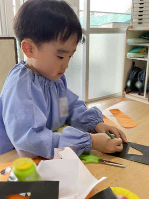 少し早いですが、10月の壁面として「ハロウィン」をテーマに自分で作りたいものを考え、画用紙を切ったり貼ったりして作りました!