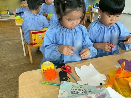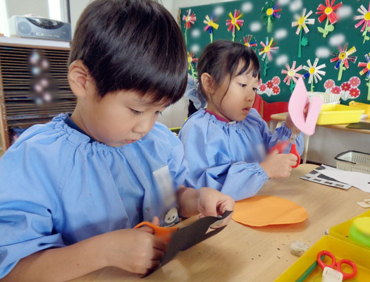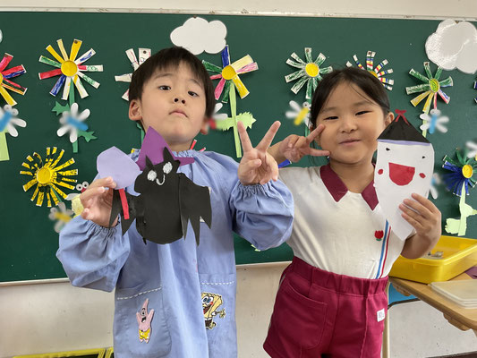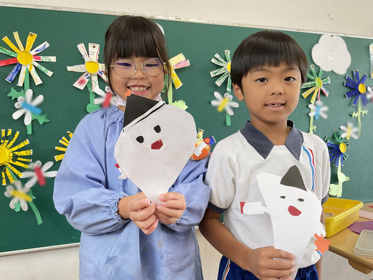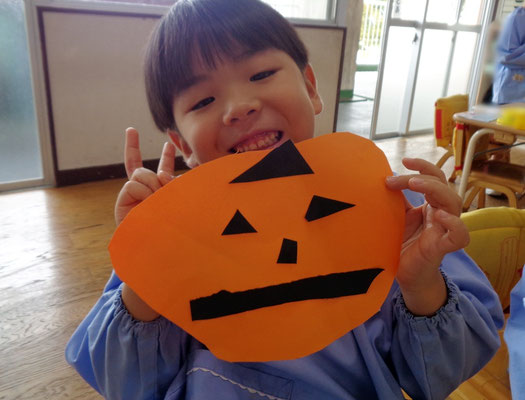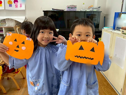 子どもたちも「ハロウィンのかぼちゃって、ジャック・オー・ランタンっていうんだ!」「おばけのお顔、どんなのにしようかな?」「トリック・オア・トリートって言ったらおかしもらえるんだよ~」などなど、たくさんお話しながら、自分なりのすてきな作品ができましたよ♪