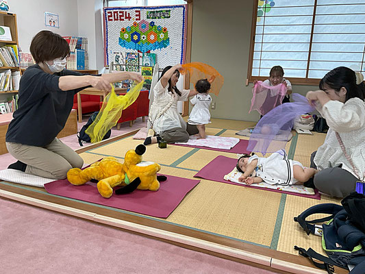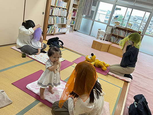 キラキラ、フワフワした布をかけてもらったり、いないいないばあっ!