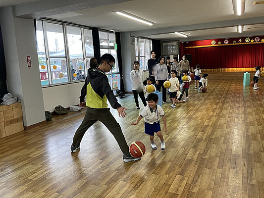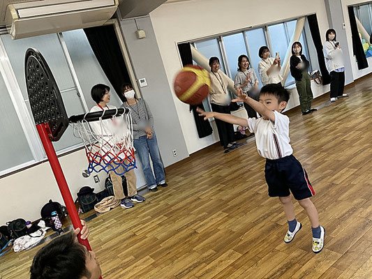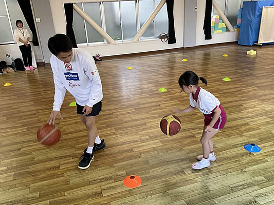 1本指でドリブルをしてみましたが、とっても小さい手…1つの指を出す事で精一杯の様子でしたが一生懸命頑張っていました。