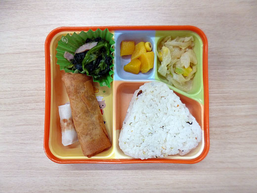 ちどり日記 · 2025/10/30 【10月30日】今日の給食です 今日のメニューは、 ・春巻 ・チーズ入竹輪 ・ほうれん草とベーコンのソテー ・キャベツのナムル ・黄桃のシロップ漬 ・鮭菜飯むすび です。 tagPlaceholderカテゴリ: